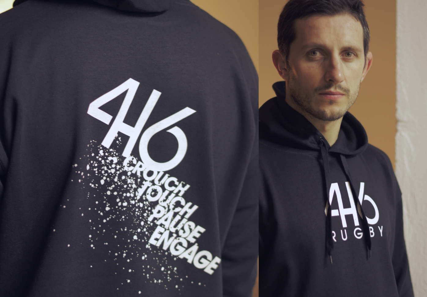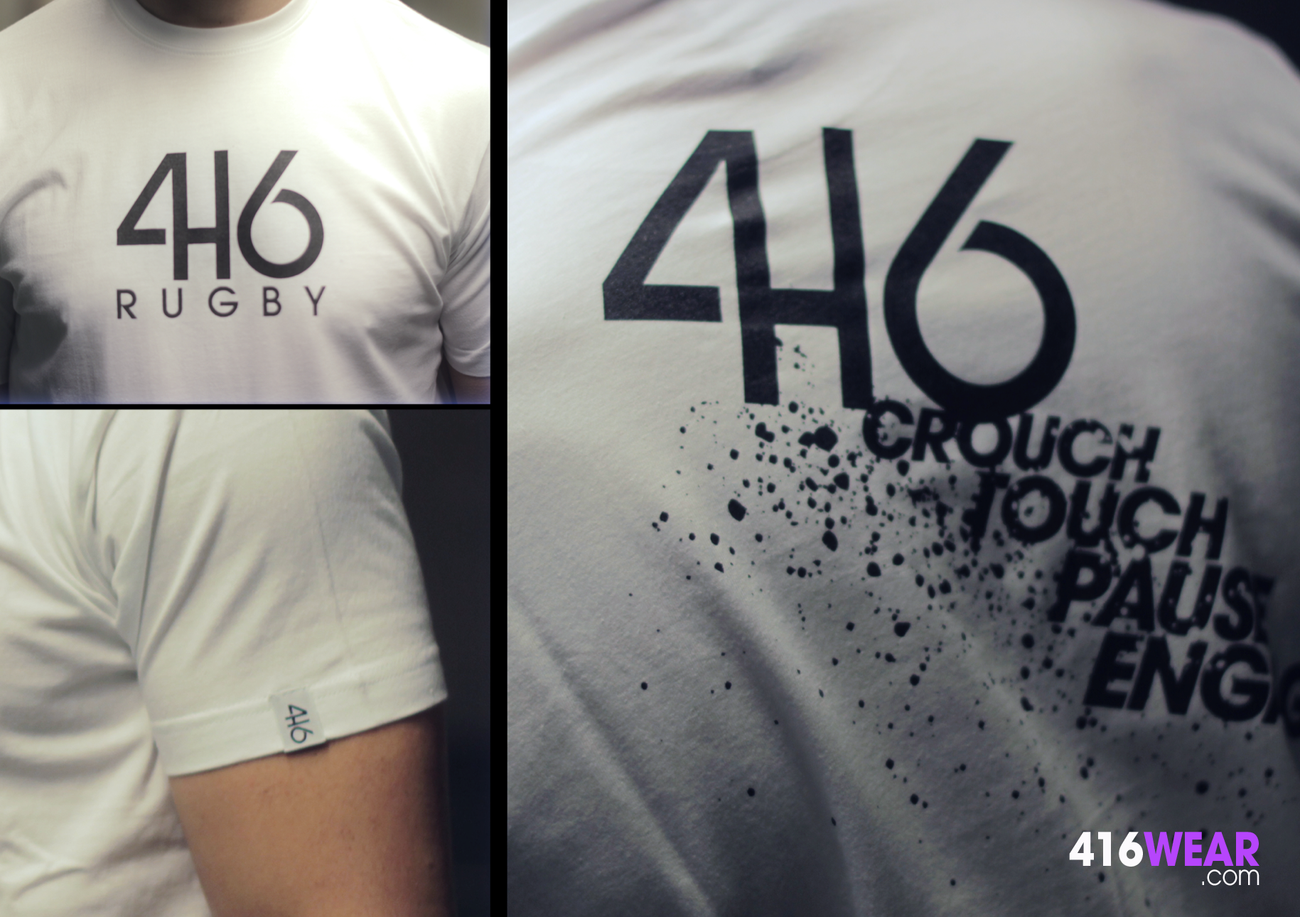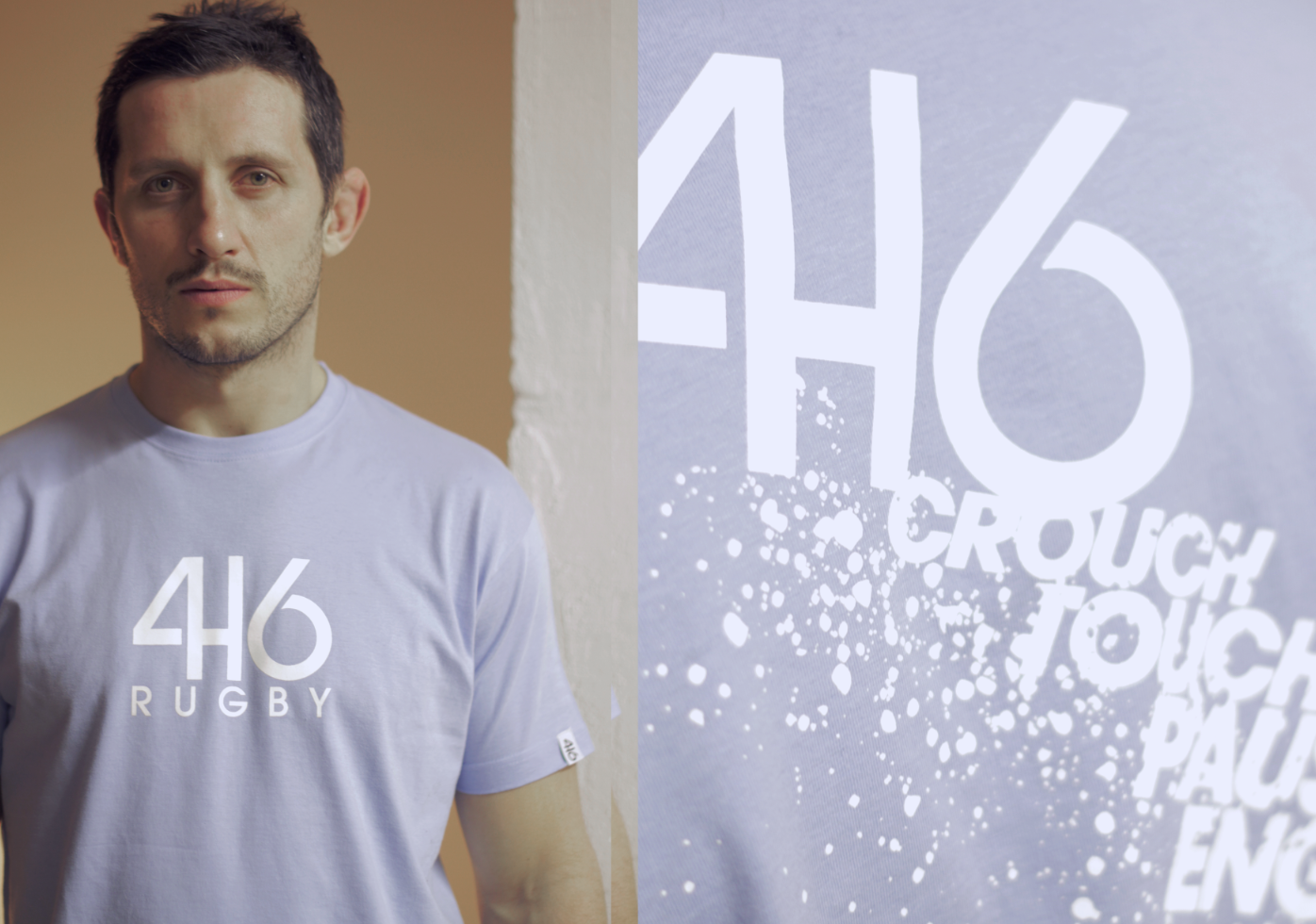 Fichier TIFF - HD - 300 dpi - Modèle Tyre avec Thomas Domingo et le modèle 416 Rugby blanc avec les commandements dans le dos "Crouch, Pause, Touch, Engage"