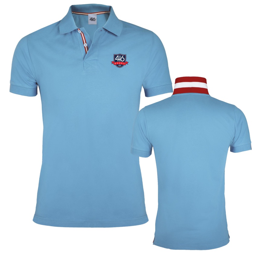 100% coton semi-peigné, col chemise et intérieur patte contrastés avec 3 boutons blanc nacré. couleur du polo : bleu ciel, liseré contrasté au col. Motif bleu/blanc/rouge devant.