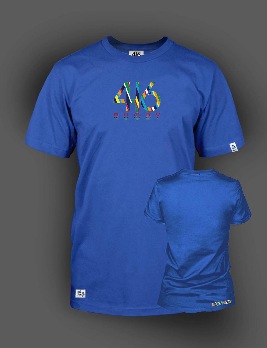 100% coton semi-peigné, col rond, qualité jersey 190, bande de propreté au col, couleur du t-shirt : bleu royal. Imprimé : motif centré, Logo 416 au dos